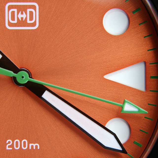 Based on input from their supporters, Diewald made some minor tweaks to the design, adding numbers to the ceramic bezel, adding a contrasting pop of color to the second hand and index, and deleting the fanciful “Seahorse” model name from the dial. All the rest of the original elements remain. Its dial is once again a sunray sandwich, offering blue, black or orange over C3 SuperLuminova, which also graces the hands and bezel. Other colors may be unlocked as stretch goals later in the campaign.