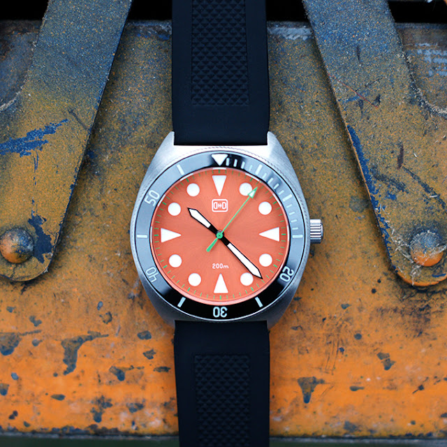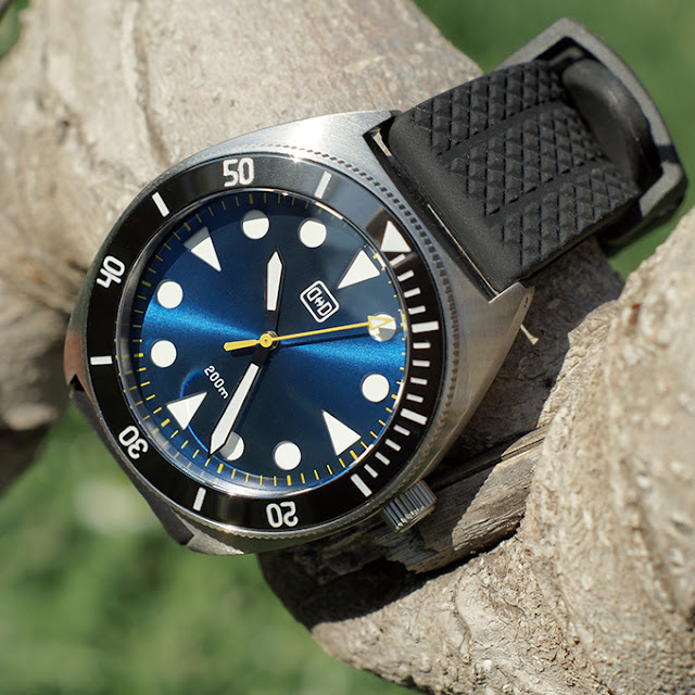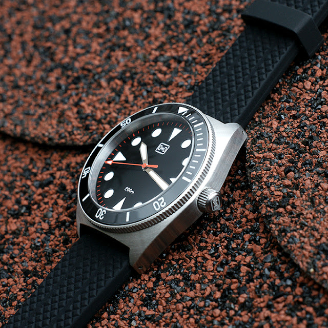 The Seahorse II’s brushed stainless steel barrel case is 43mm wide and 48mm long with a double domed, AR coated sapphire crystal and decorated case back. It is rated for 200m water resistance and has a signed, screw down crown. Integrated, drilled lugs hold the 22mm rubber strap. The 120-click, unidirectional bezel boasts a tough and glossy ceramic insert. As before, Diewald uses a Seiko NH35 automatic, a reliable 24-jewel unit that hacks, hand winds, and moves at 21.6k bph.